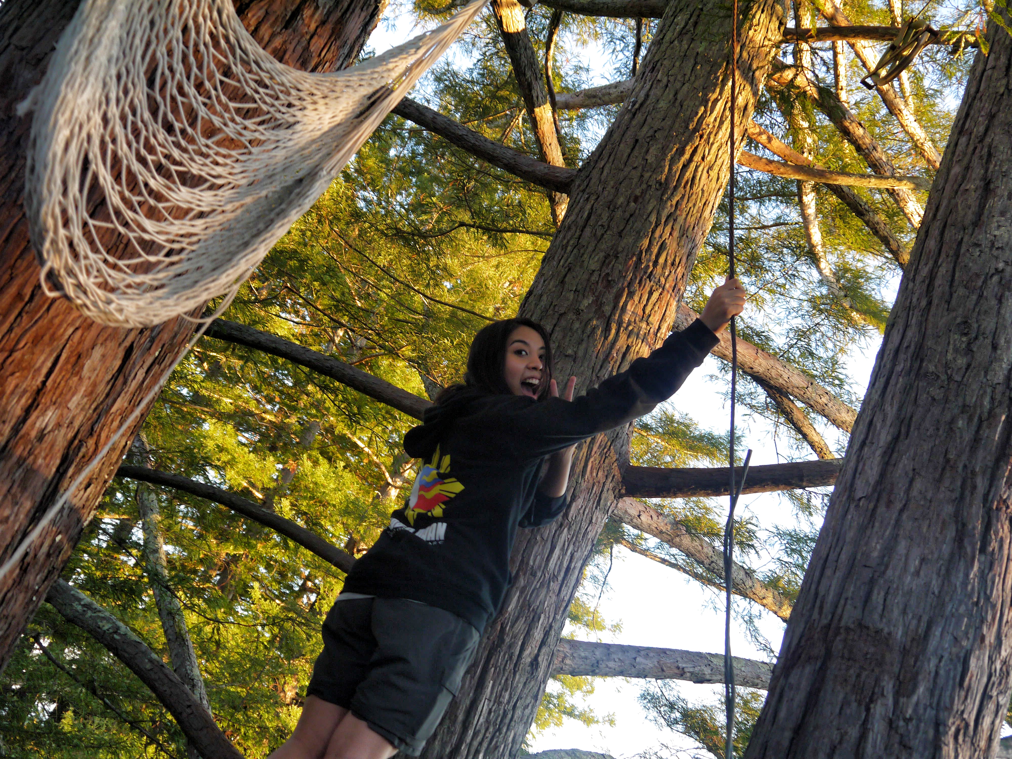 The massive tree we climbed had two levels–the first had a wooden platform, complete with a trapdoor, painted art on the floor, a bench, and a hammock. The final and topmost level simply had a big net slung over several branches, dangling over emptiness.